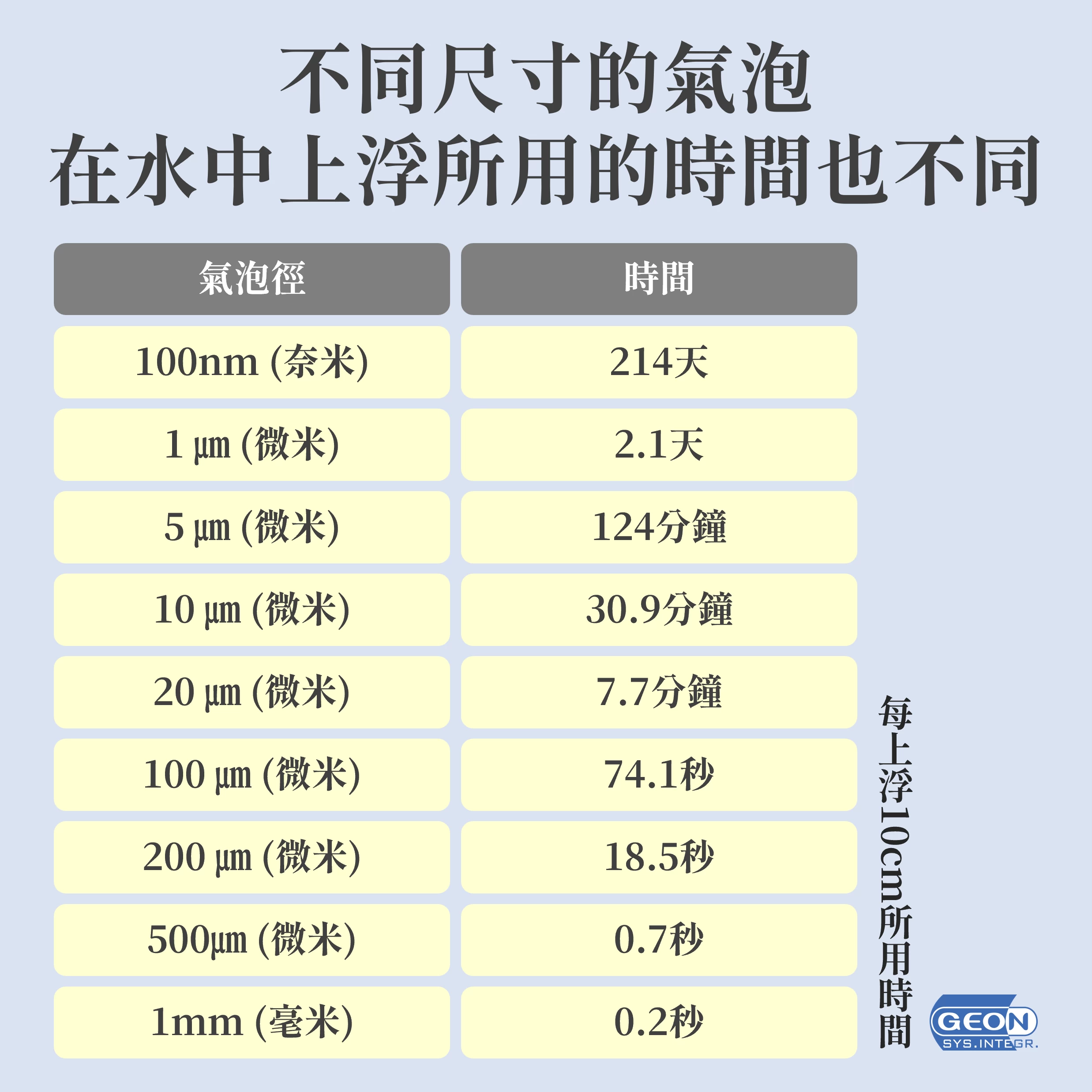 我們透過實驗以及各方提供的數據可以知道,不同尺寸的氣泡在水中上浮所用的時間也不同,尺寸越大的氣泡,上浮的速度也就越快。根據(圖一)我們可以看出不同尺寸上浮所需要的時間,而廣鴻製造出的奈米氣泡,可以在水中維持高達214天。